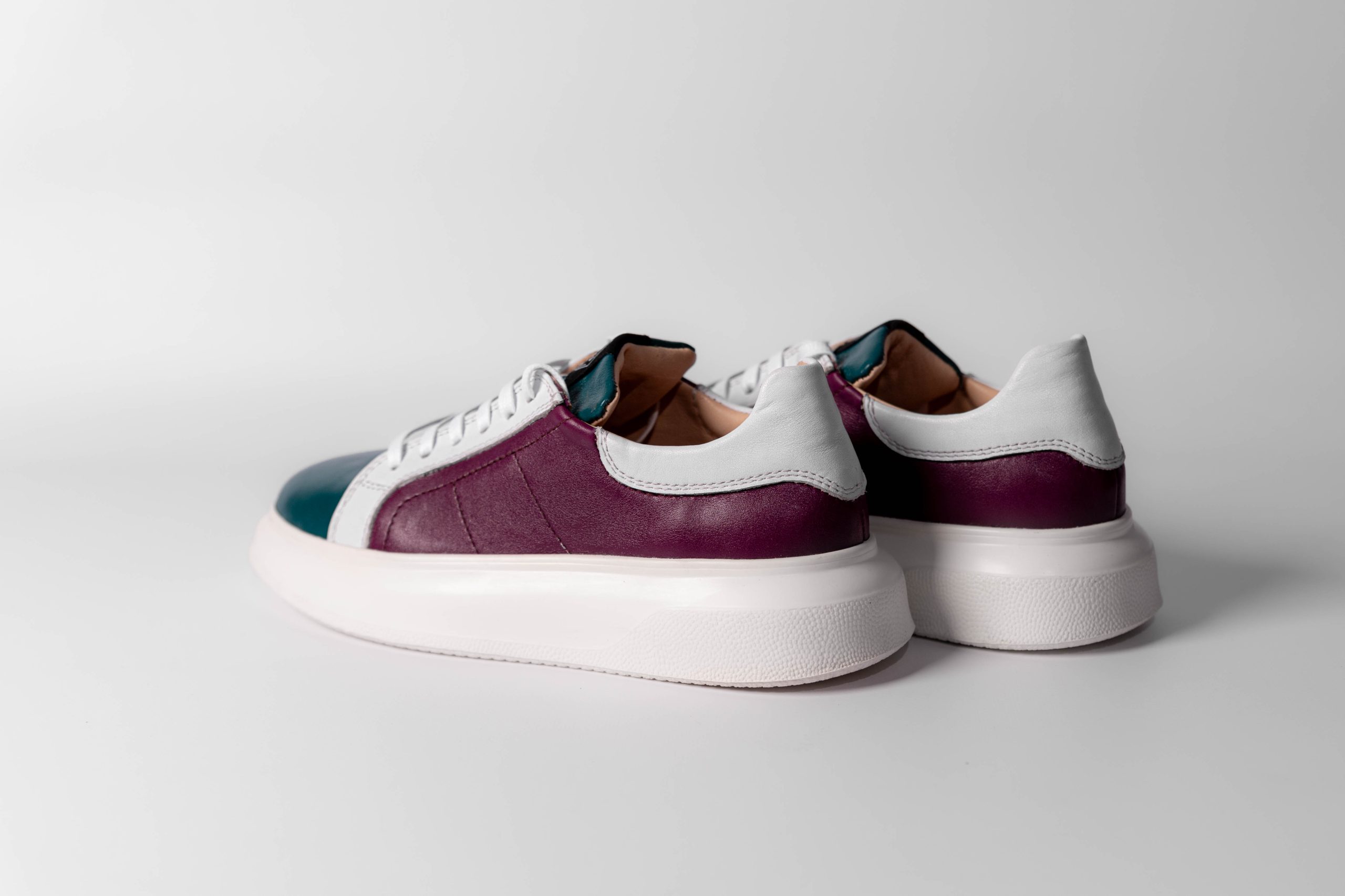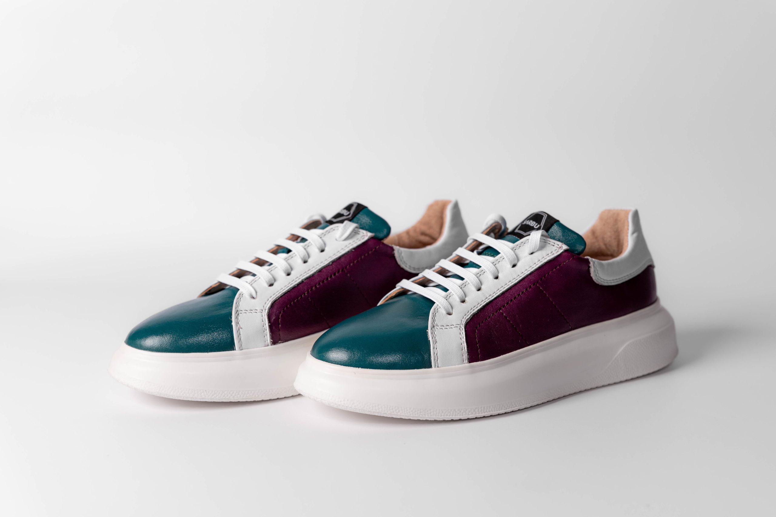 Baskets basses de sport. En cuir à texture tressée. Embellies par un imprimé marbré bleu.