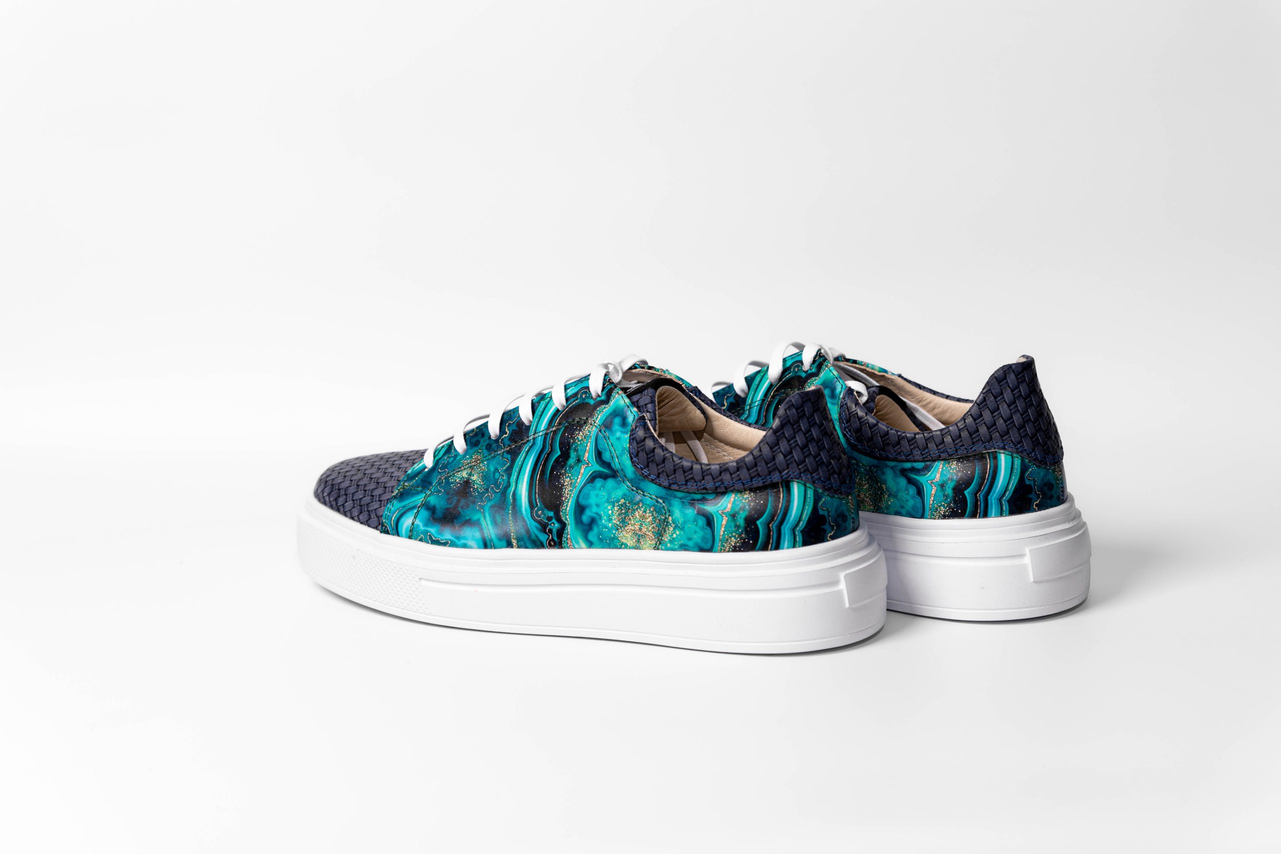 Baskets basses de sport. En cuir à texture tressée. Ornées d’un imprimé marbré dans des tons bleus.