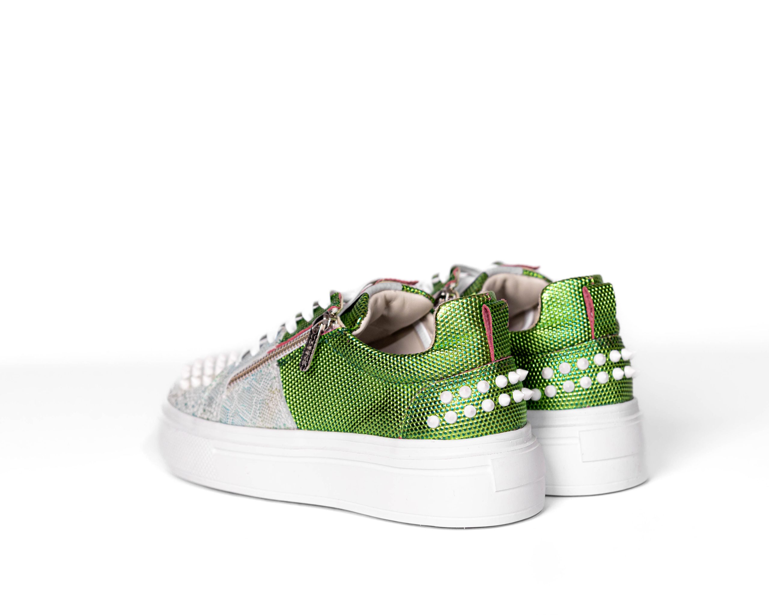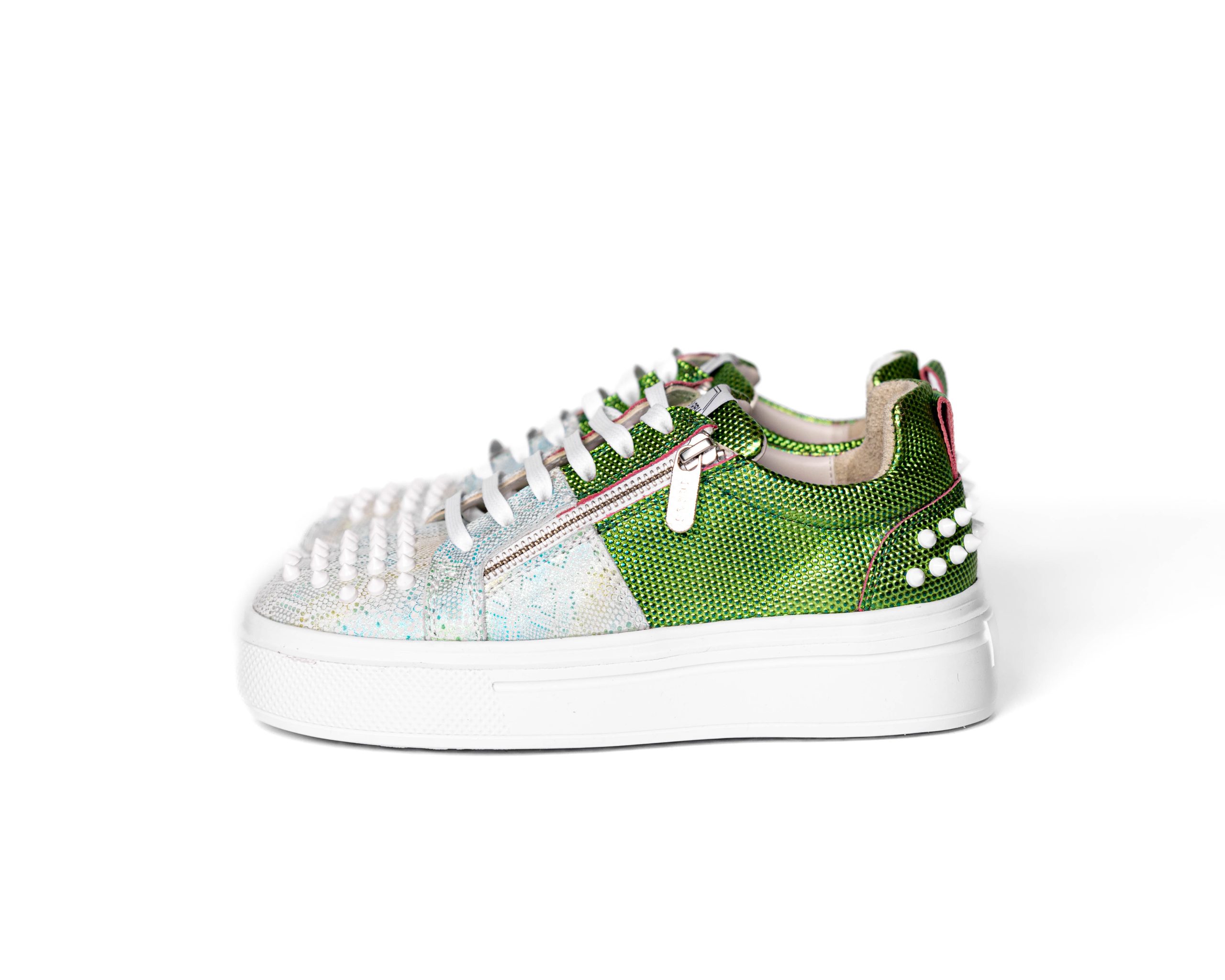 Combinaison de cuir effet métallisé et d’empiècements décoratifs.