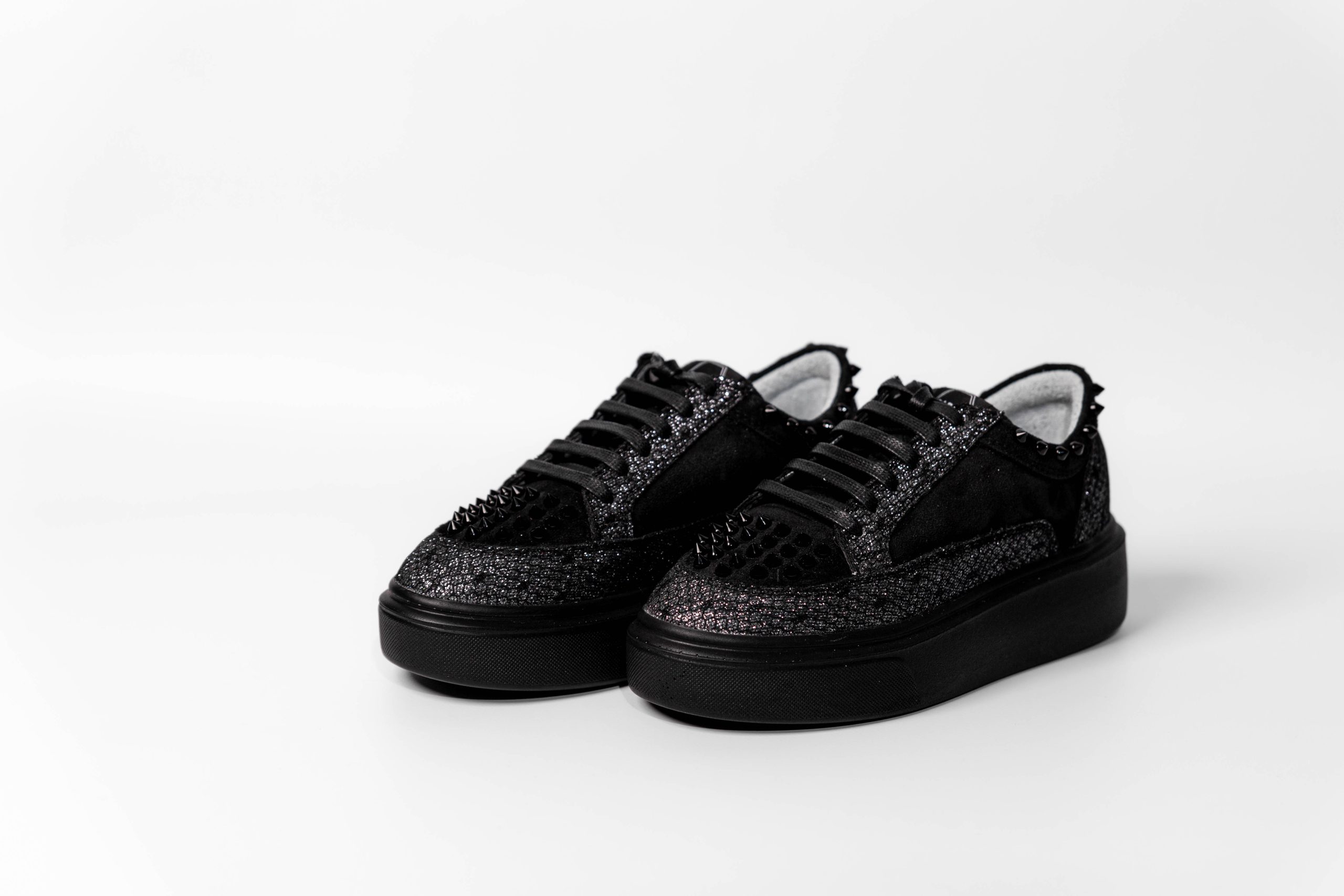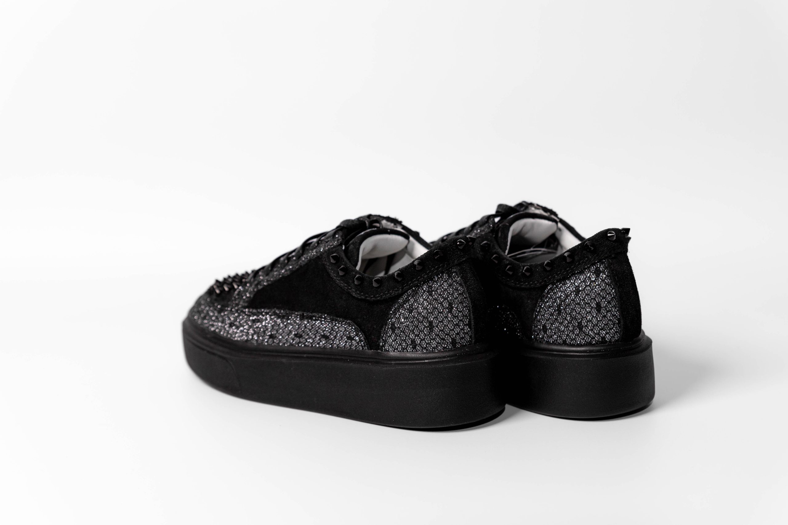 Baskets basses de sport. Combinaison de daim noir et de tissu pailleté. Accessoirisées de clous noirs.