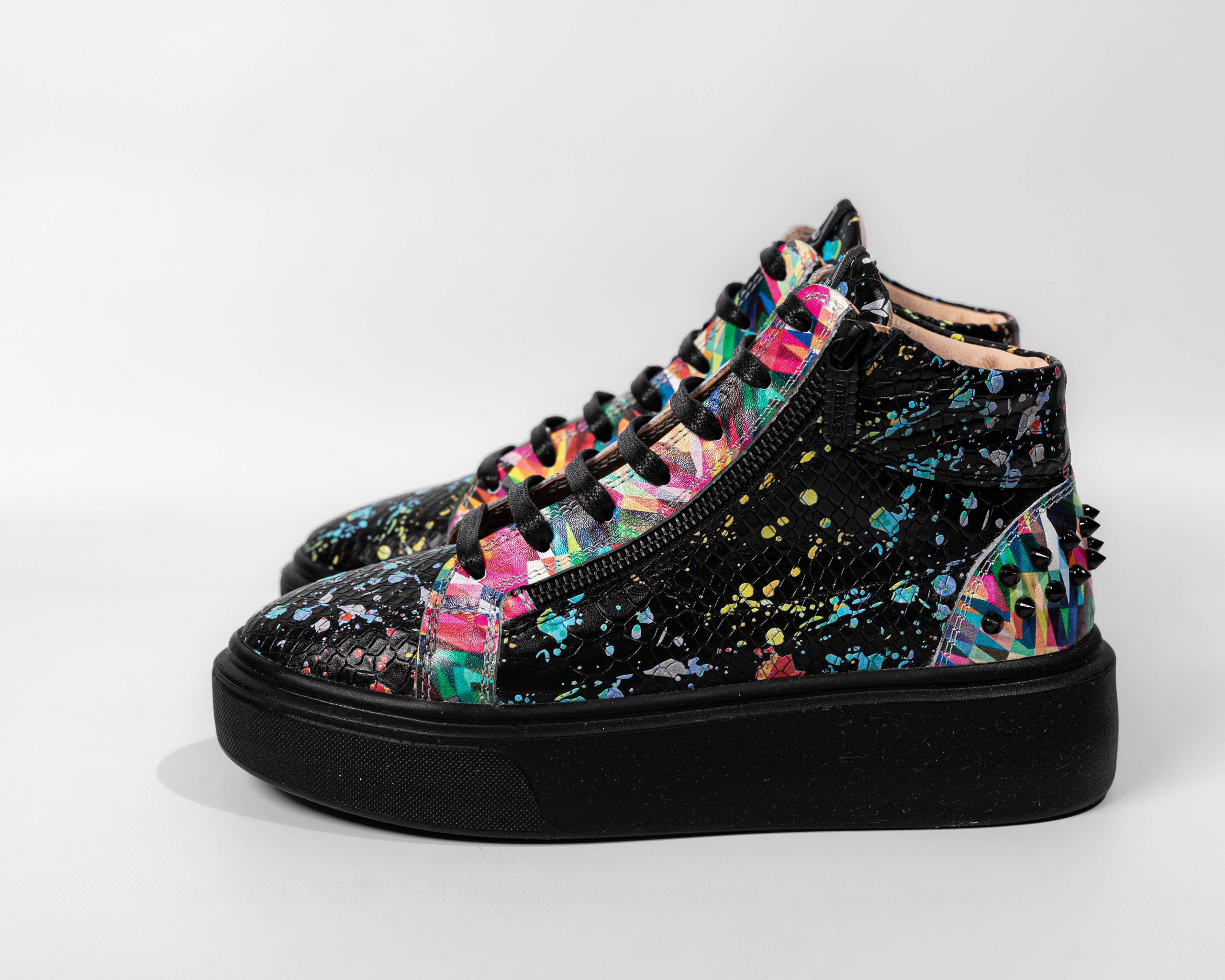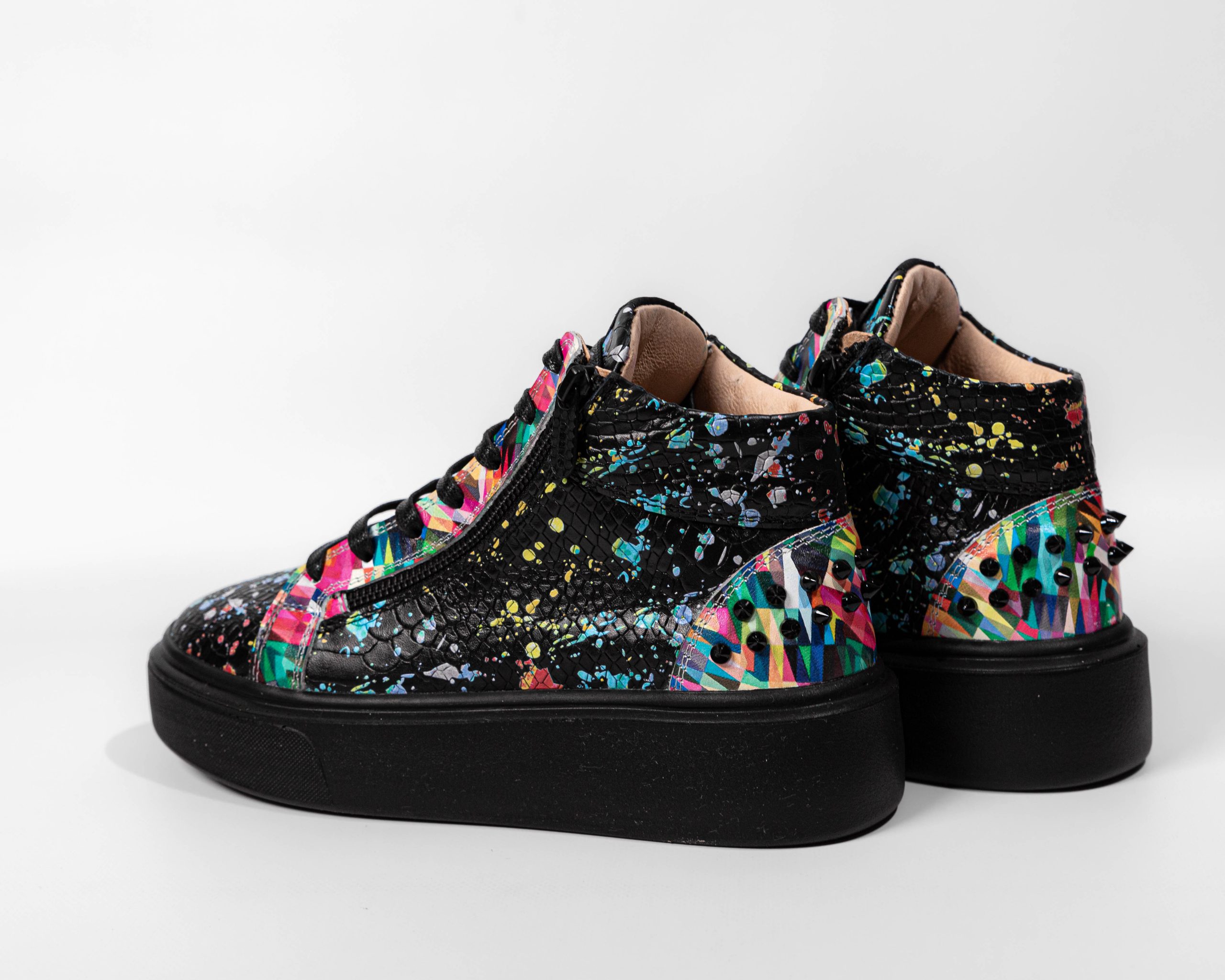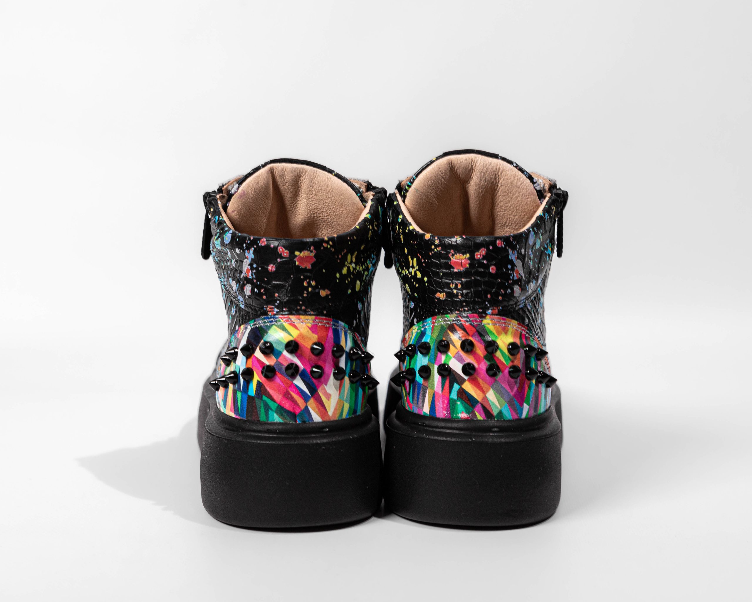 Fabriquées en cuir embossé python et cuir coloré. Ornées de clous noirs. Fermeture à lacets et zip. Hauteur de semelle : 4-4,5 cm, 100 % polyuréthane.