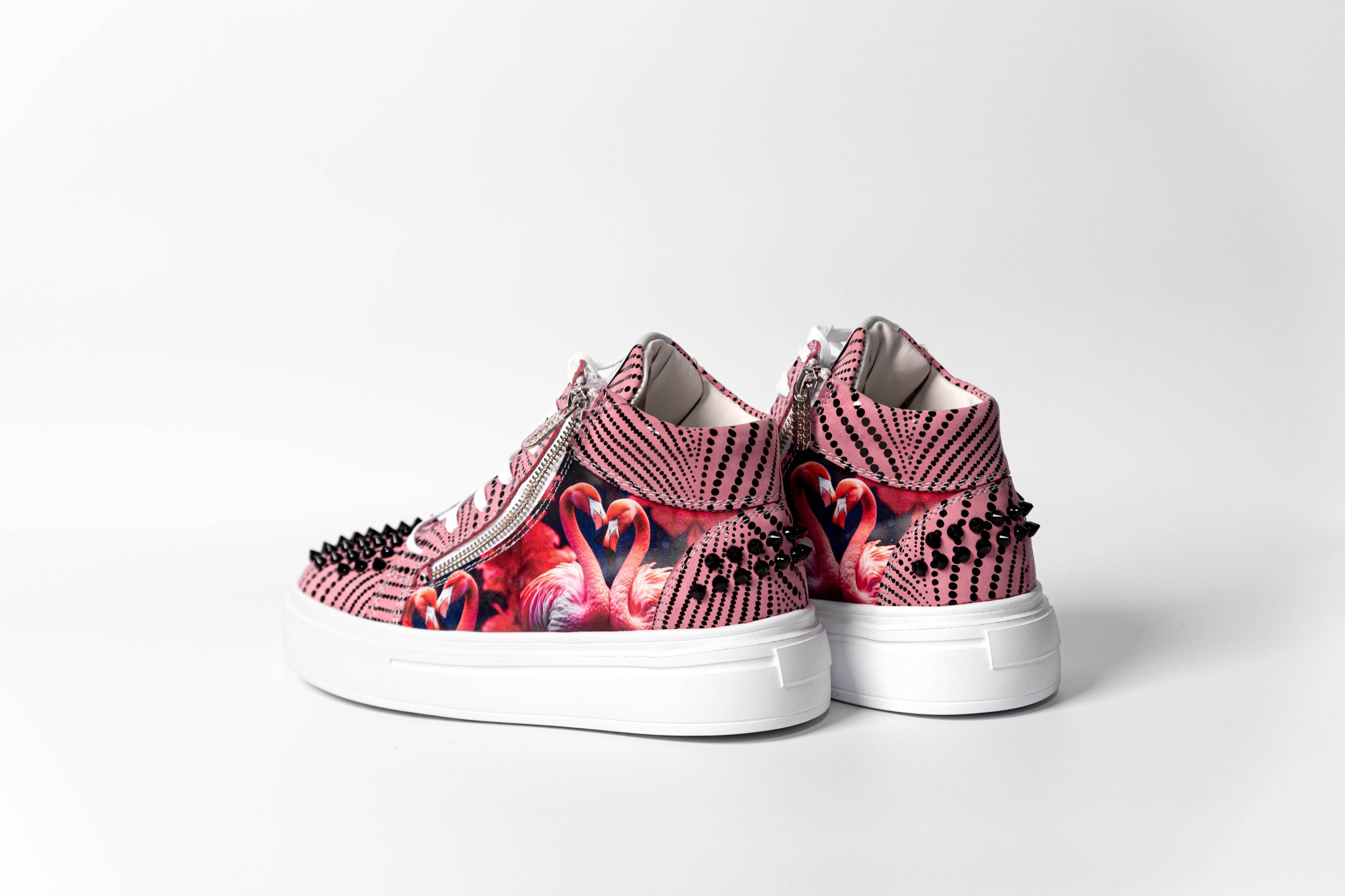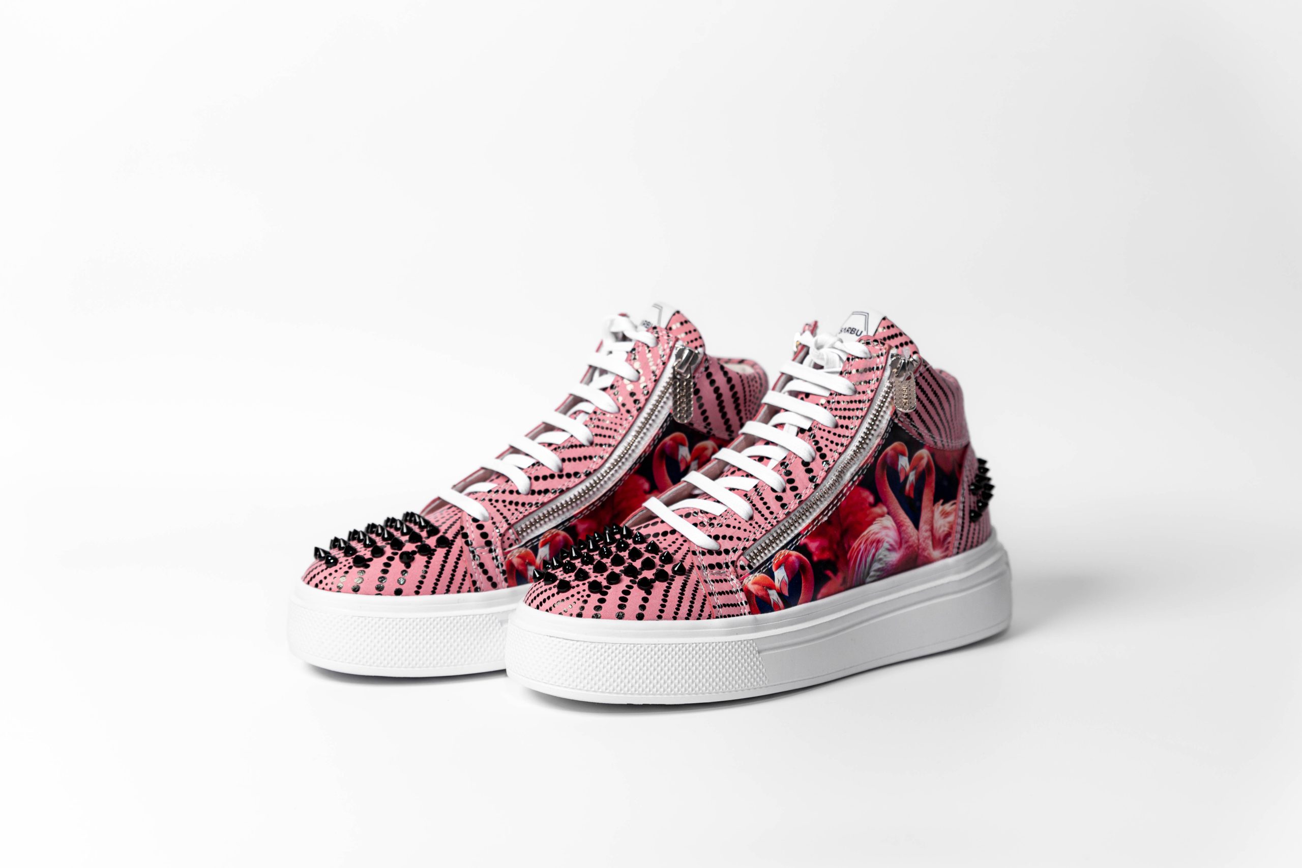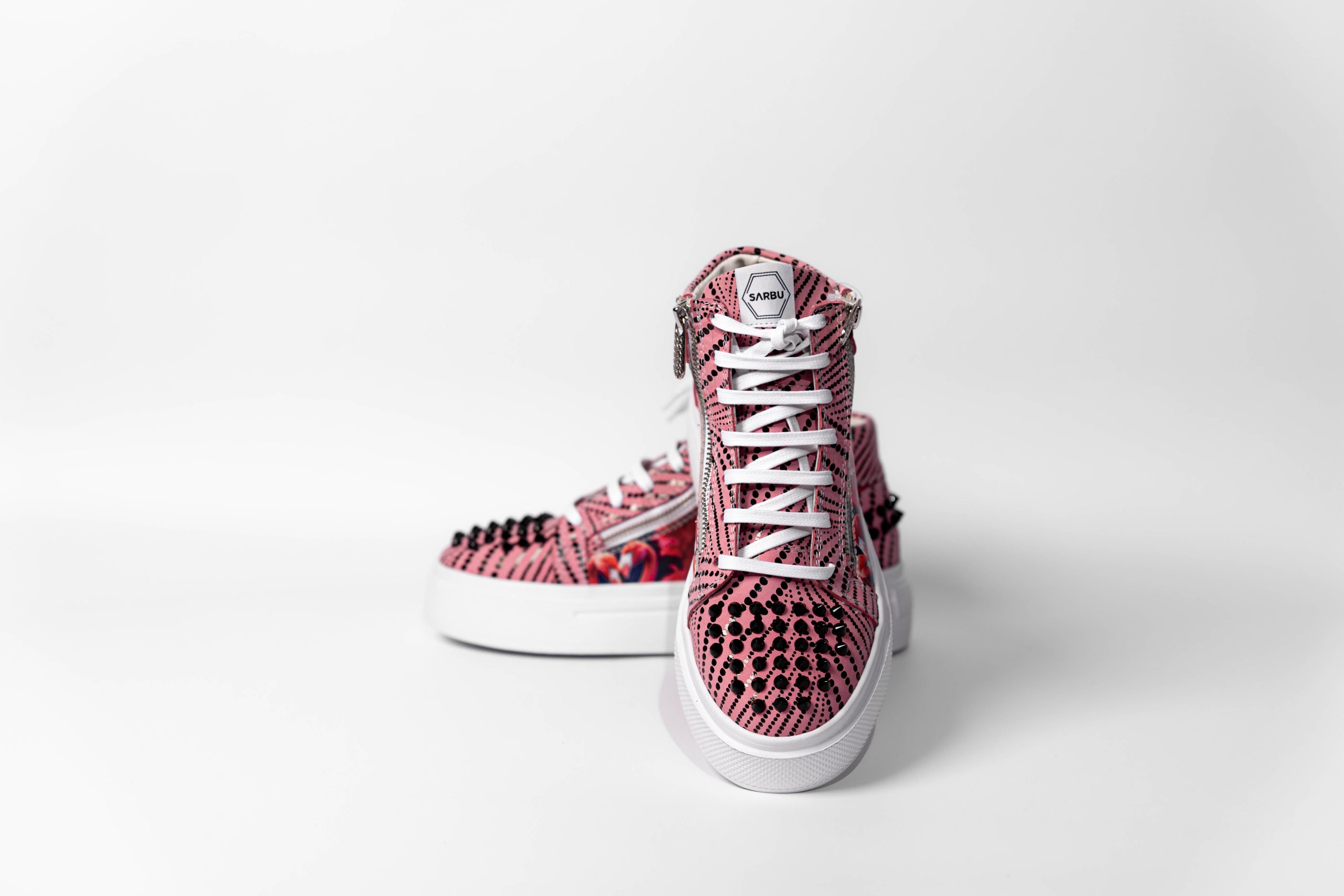 Baskets de sport montantes. En cuir rose avec motifs géométriques noirs et cuir imprimé. Accessoirisées de clous noirs moyens à l’avant et à l’arrière.
