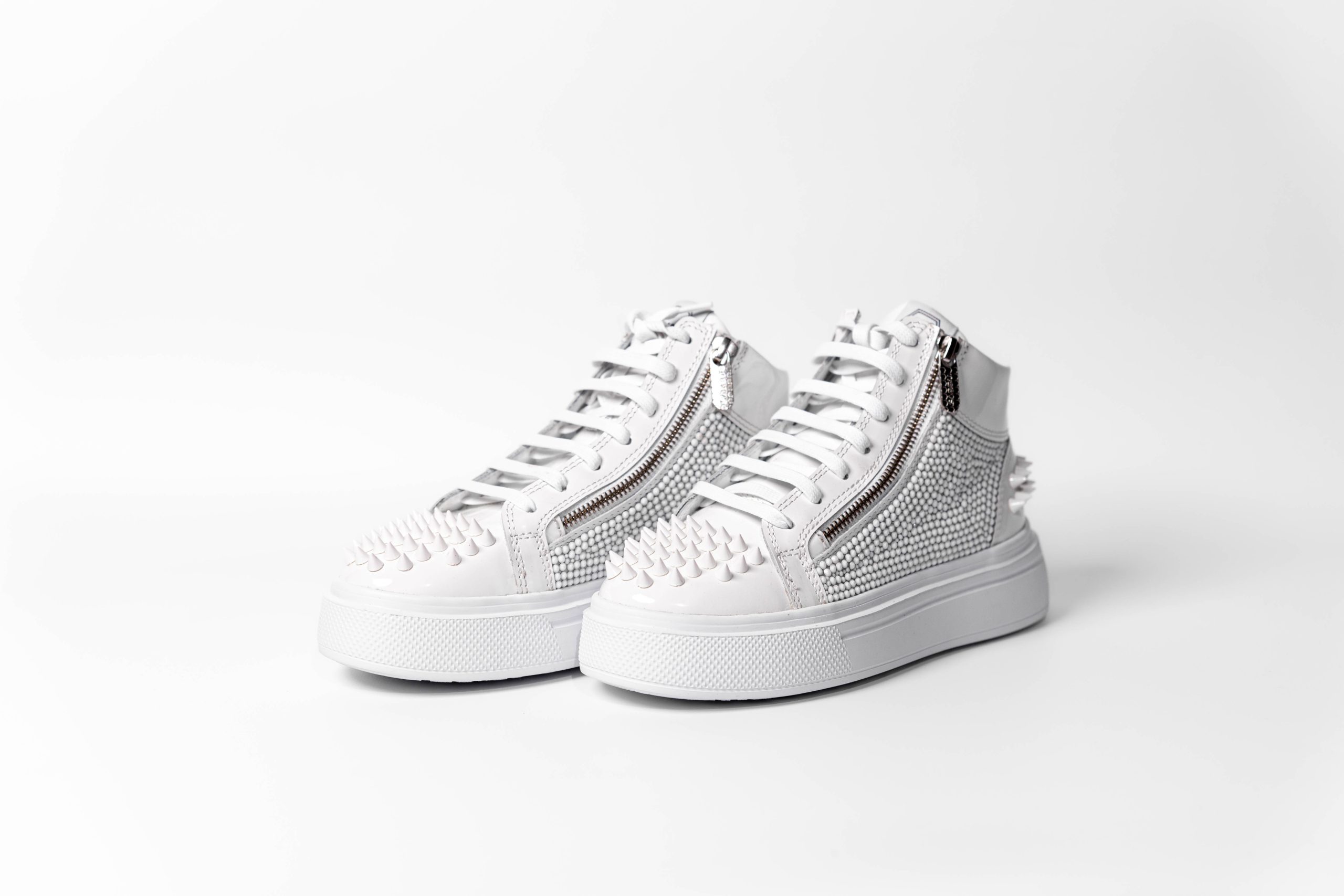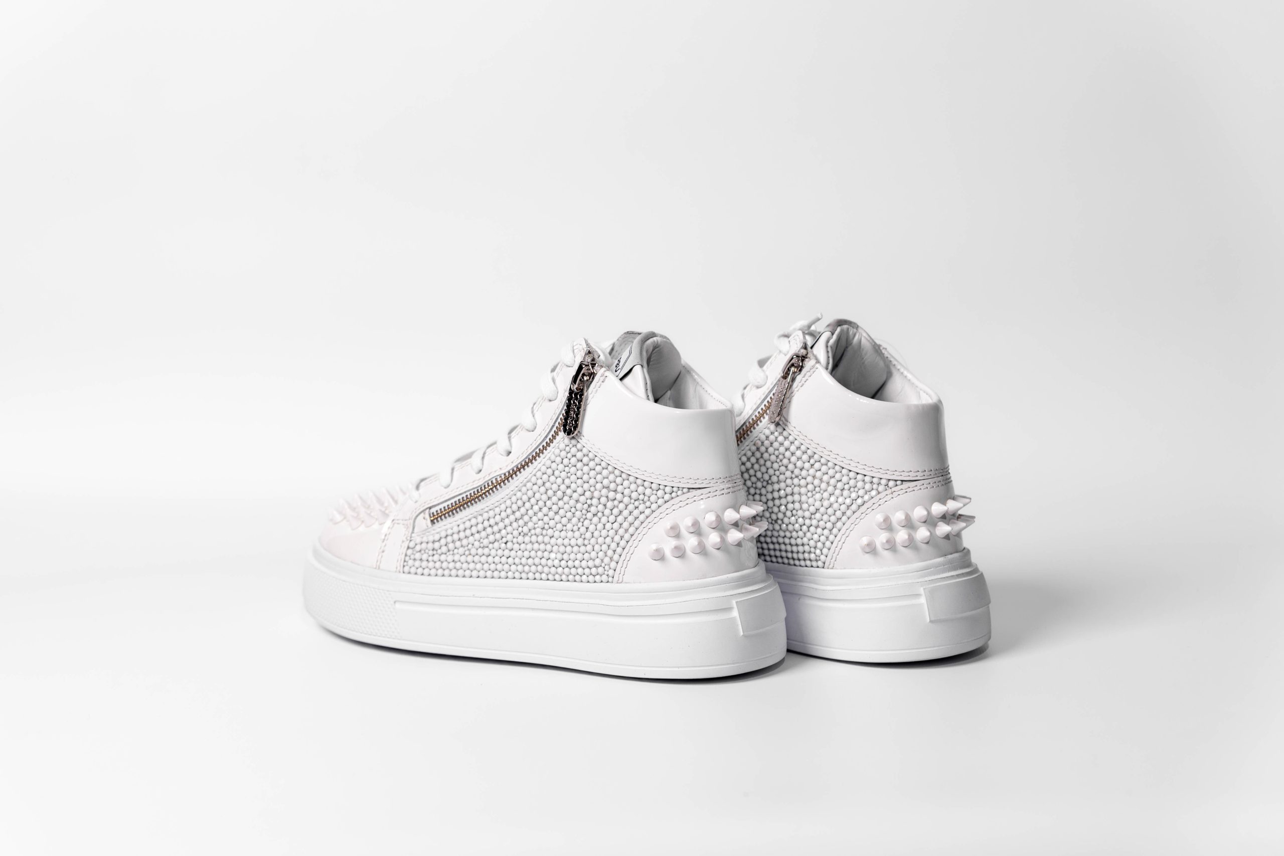 Baskets de sport montantes. En cuir blanc brillant. Accessoirisées de perles blanches et de gros clous blancs à l’avant et à l’arrière.