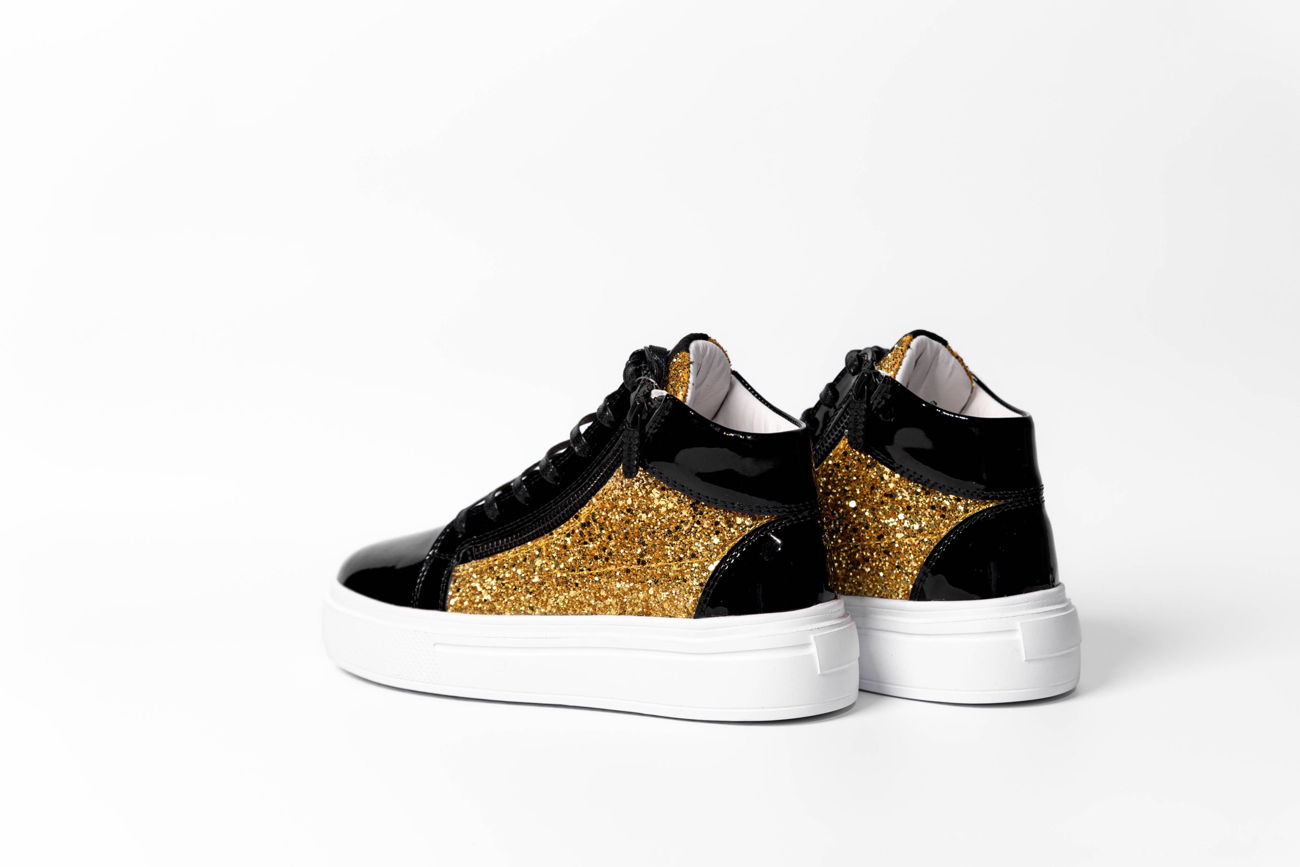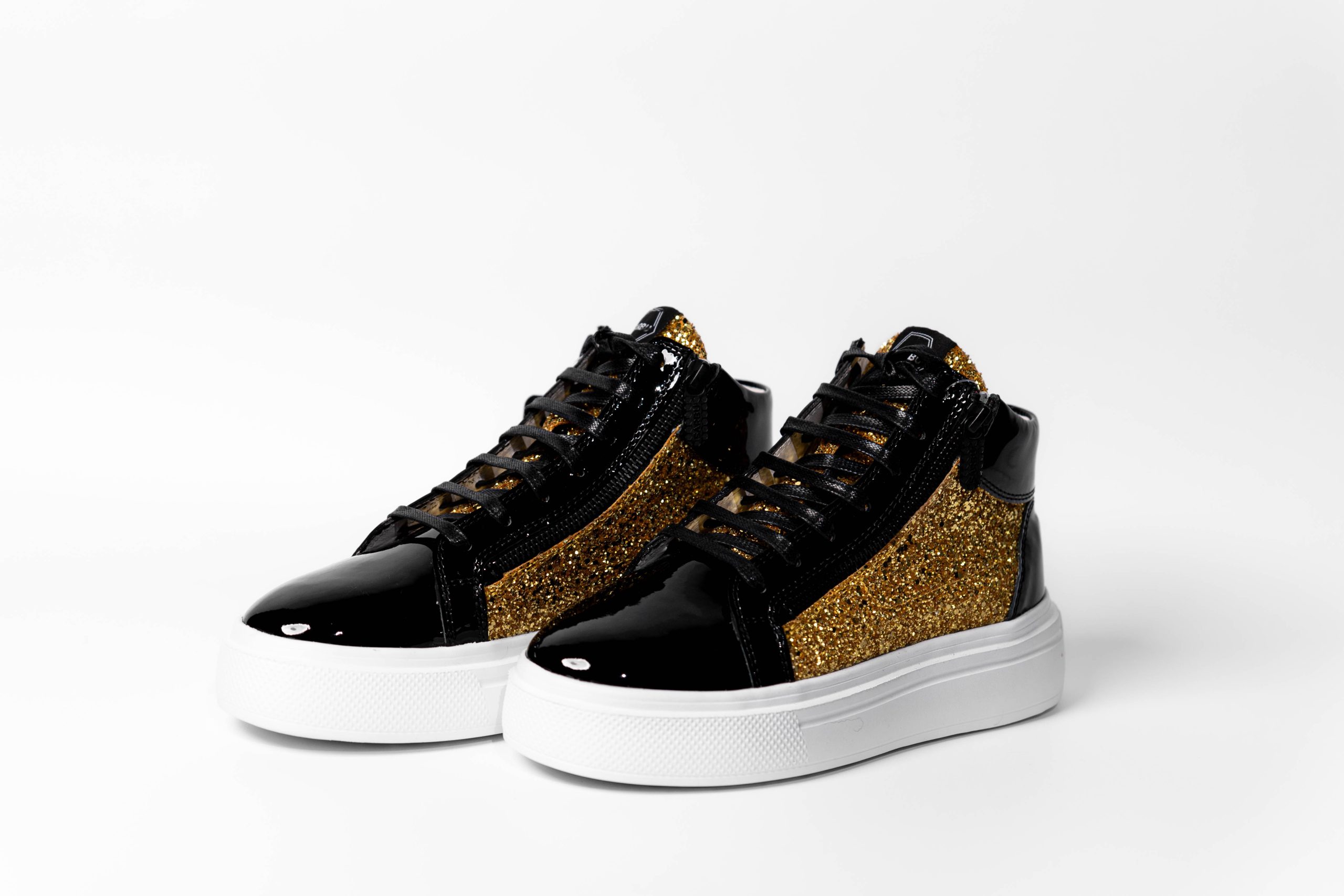Baskets montantes de sport. Combinaison de cuir brillant et de tissu pailleté.