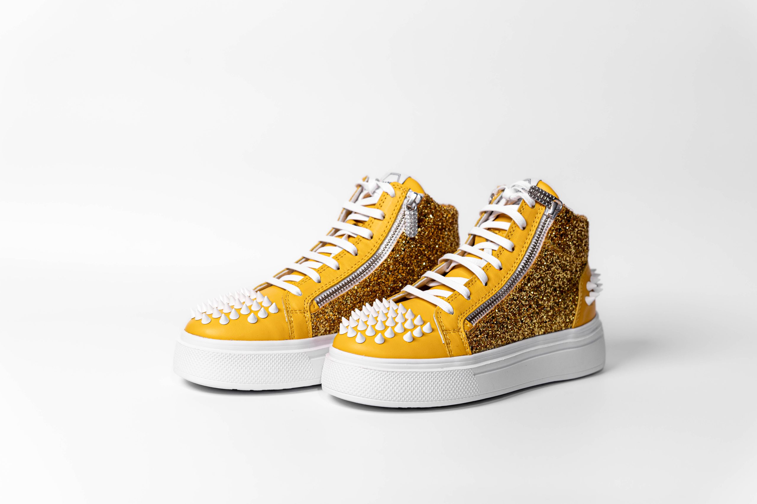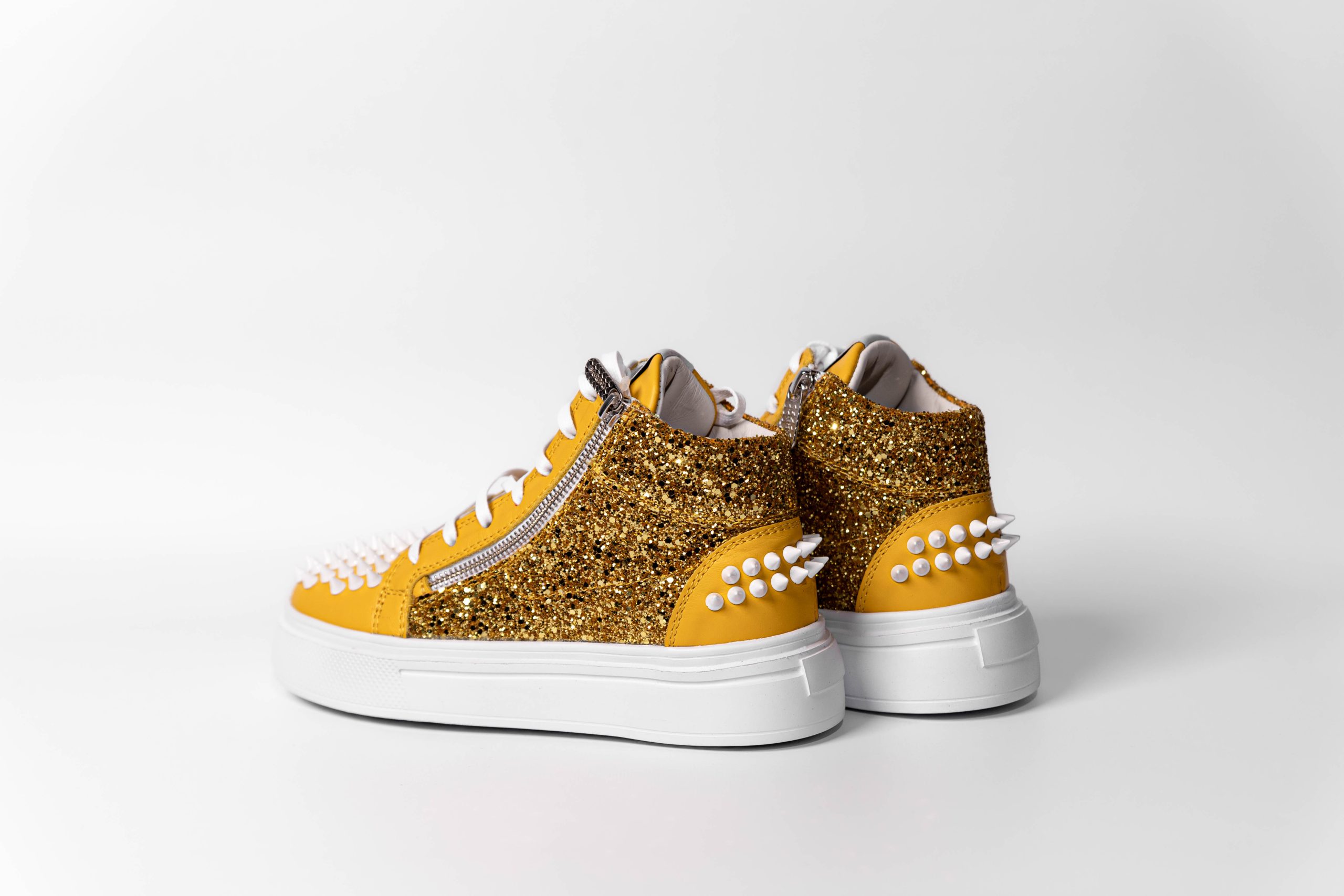 Baskets montantes de sport. Combinaison de cuir brillant et de tissu pailleté. Accessoirisées de clous blancs à l’avant et à l’arrière.