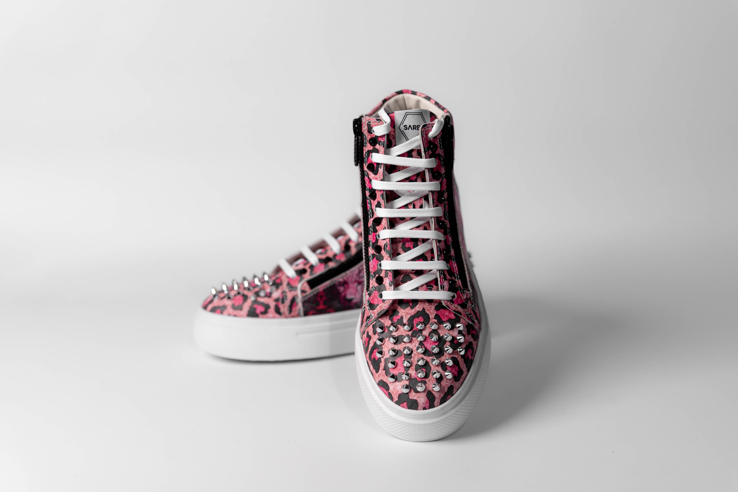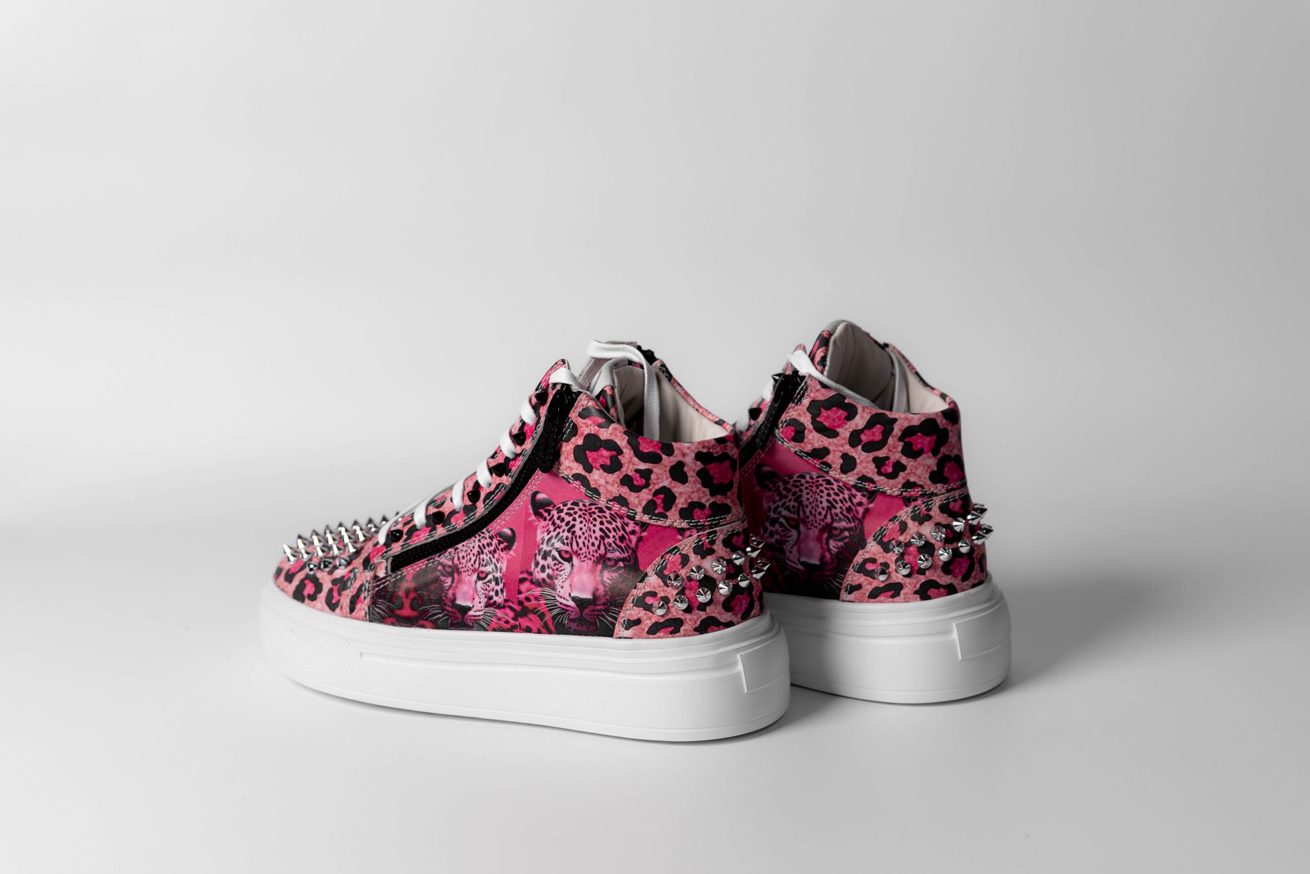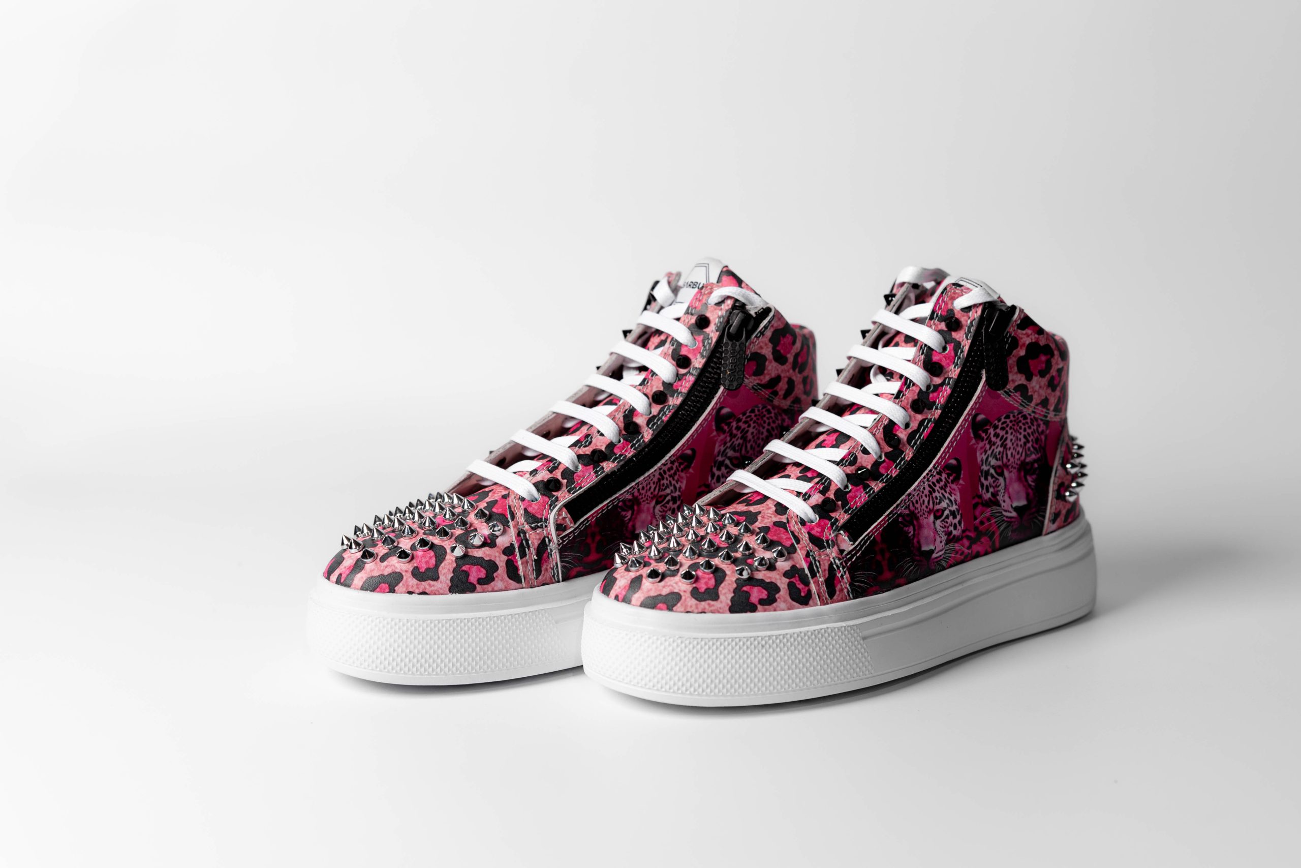Baskets de sport montantes. En cuir sobre, ornées d’un imprimé et de clous.