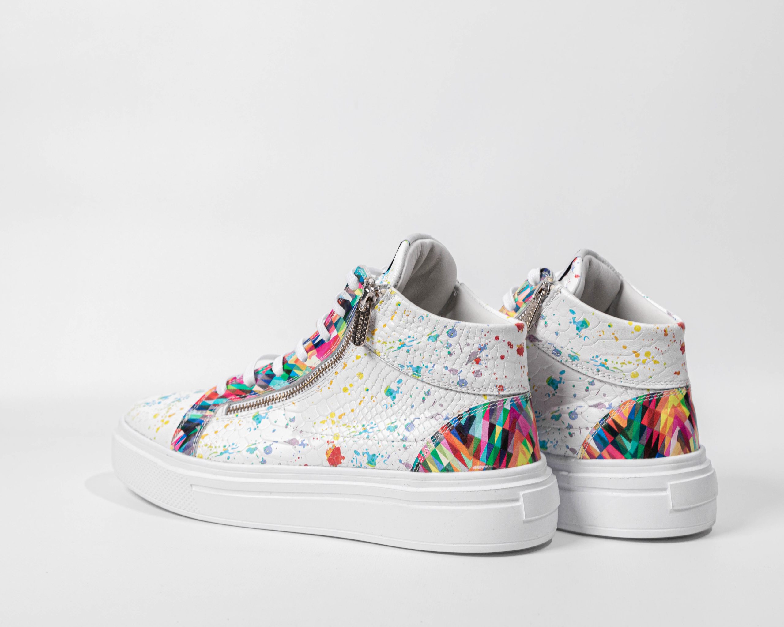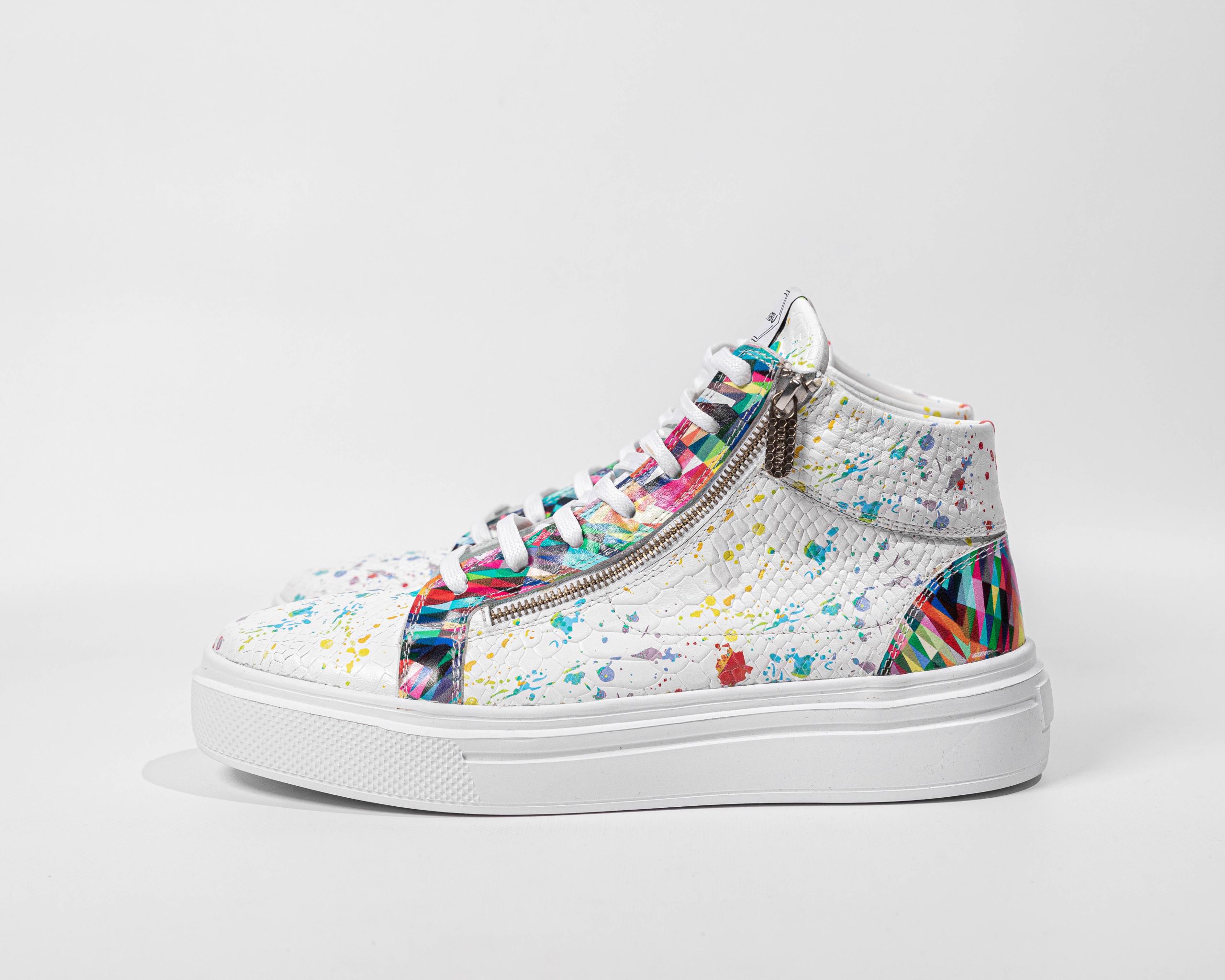 Fabriquées en cuir embossé python et cuir coloré. Accessoirisées de clous argentés. Fermeture à lacets et zip. Hauteur de semelle : 4-4,5 cm, 100 % EVA.