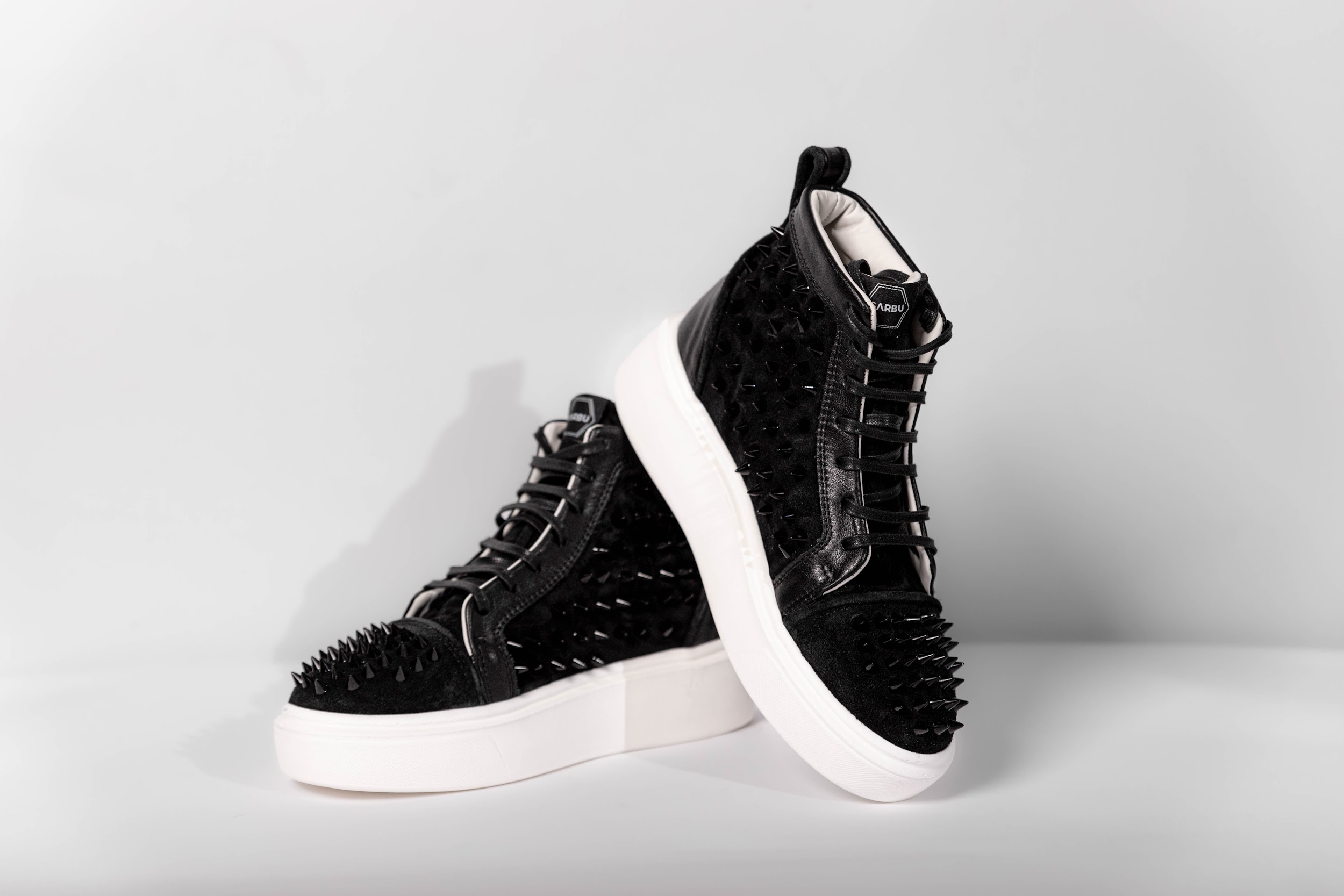 Confectionnées en cuir texturé retourné et cuir noir uni.